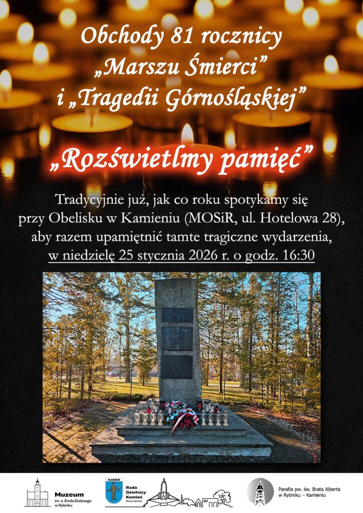 Ogłoszenie społeczne: Dziś – w niedzielę 25.01, o godz. 16.30 – w ramach obchodów 81. rocznicy MARSZU ŚMIERCI i TRAGEDII GÓRNOŚLĄSKIEJ – „rozświetlamy pamięć” spotykając się przy OBELISKU w Kamieniu…